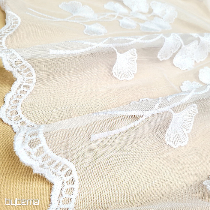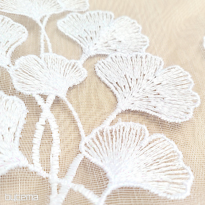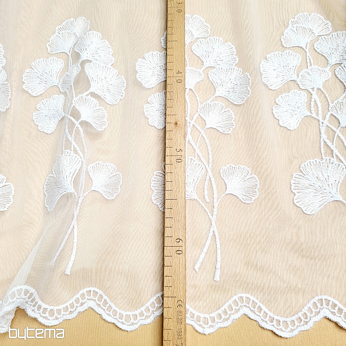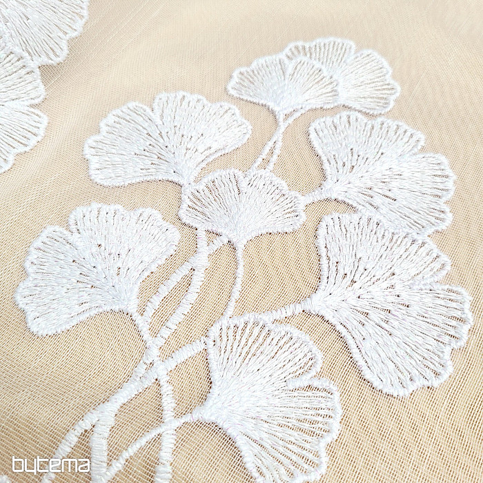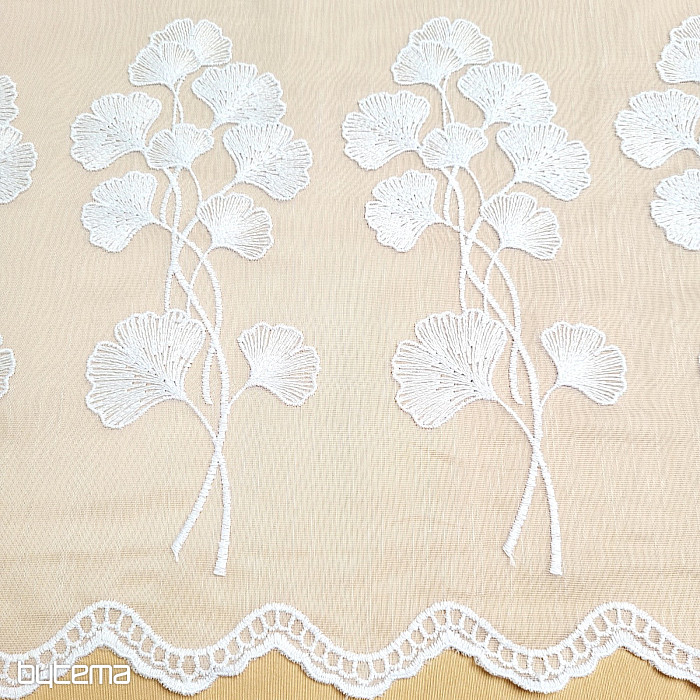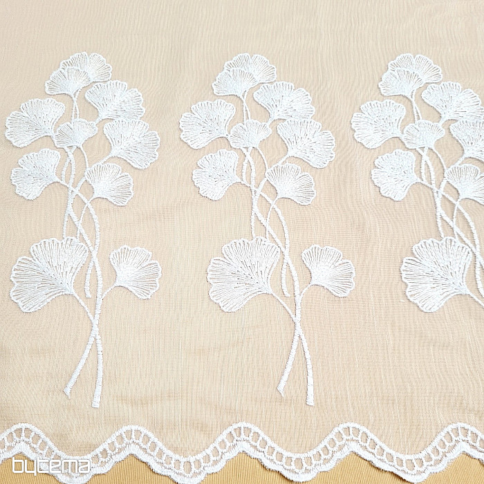 Modern hímzett függöny, amely teljes felületén sima, és nagy ginko biloba virágszegéllyel díszített.