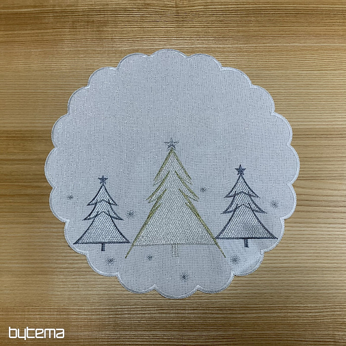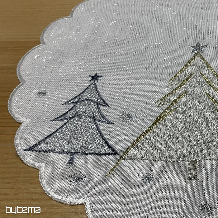 Ez az elegánsan és finoman hímzett karácsonyi alátét két színű fákkal bájos kiegészítője lesz otthonodnak. Az alátét finom ezüst és arany fonallal készült.