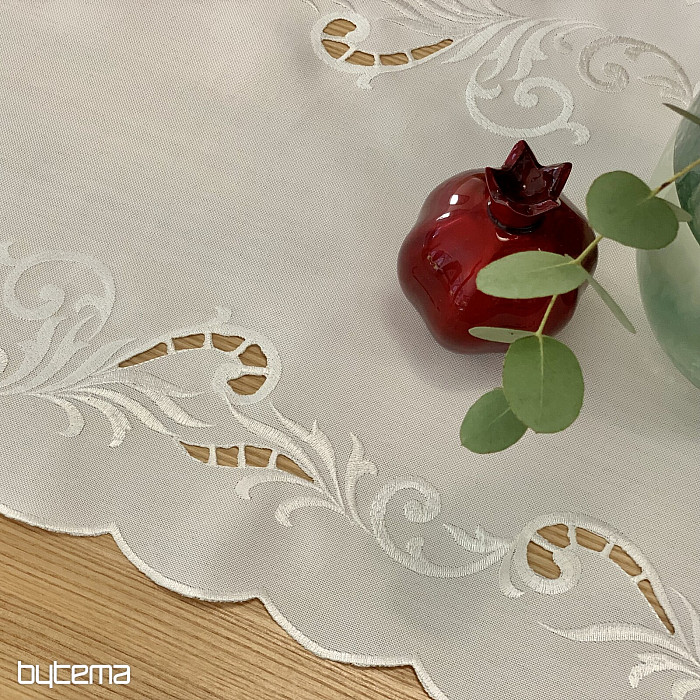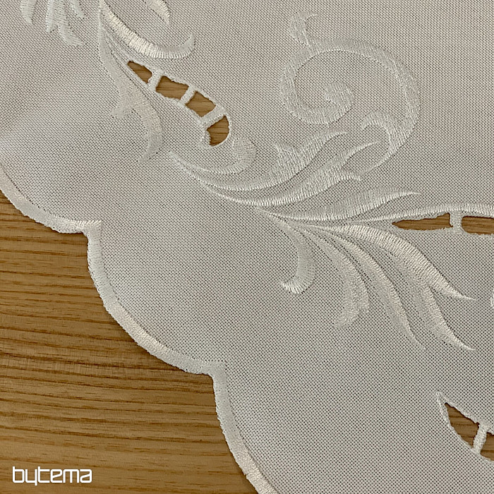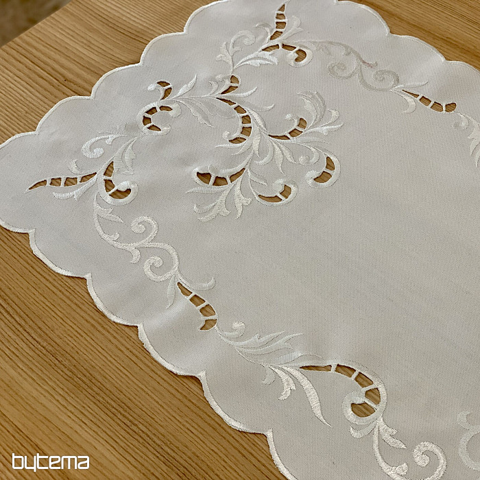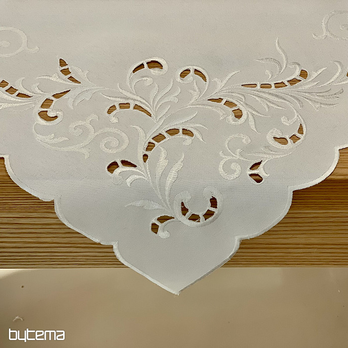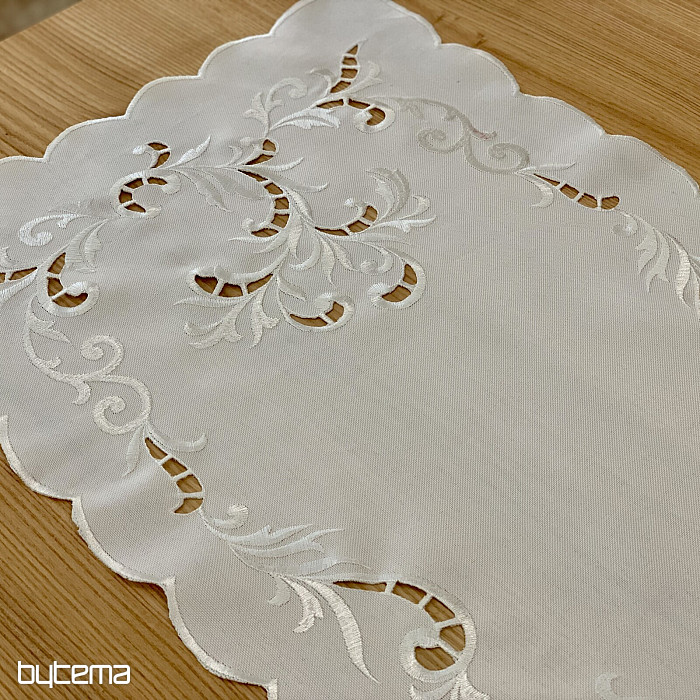 Egy finom, áttört hímzéssel díszített terítő, amely ünnepi alkalmakra alkalmas.