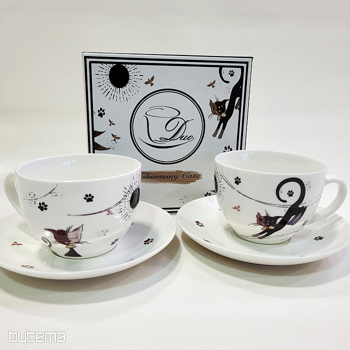 Két darab 280 ml-es porcelán bögre és két csészealj található benne. A teljes készlet nyomtatott papírdobozban található.