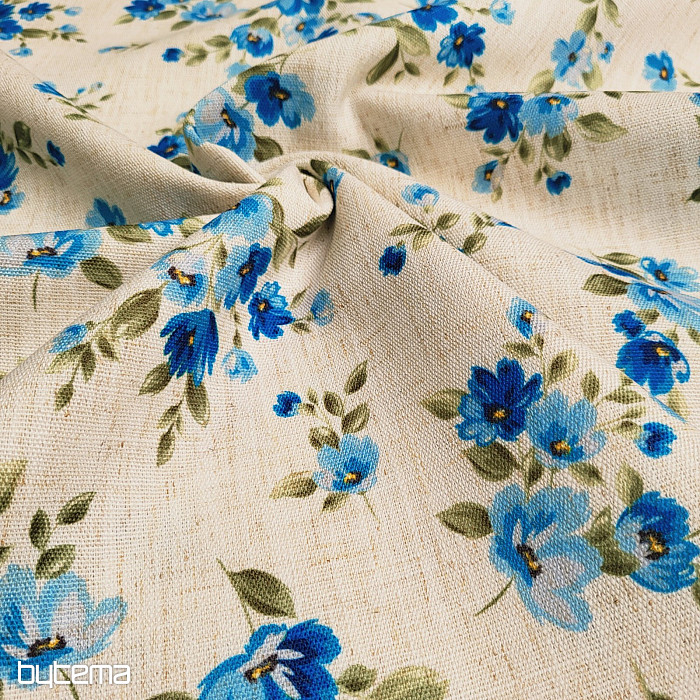 Dekoratív szövet tavaszi virágokkal, nefelejcskék színben, díszíteni fogja a konyháját és a pergoláját.