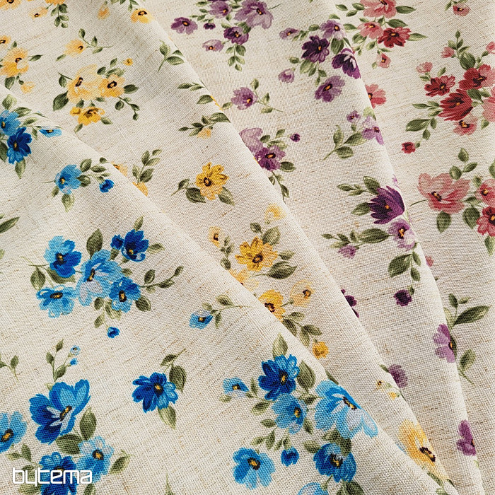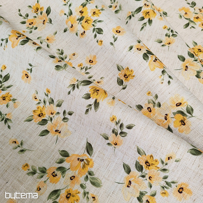 Dekoratív szövet tavaszi virágokkal, gazdag sárga színben díszíti majd a konyháját és a pergoláját.