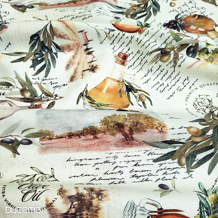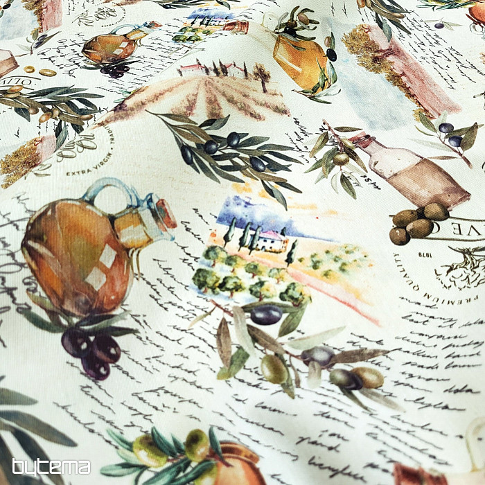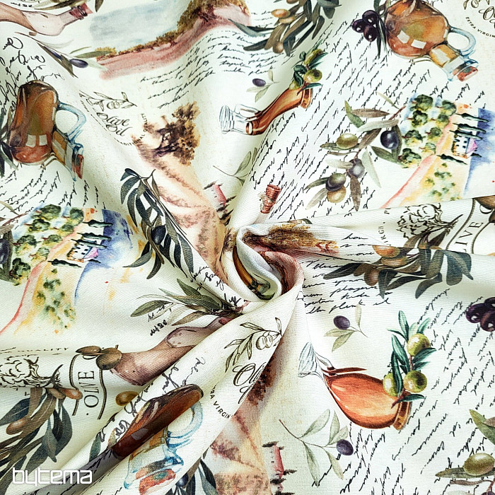 Az olajbogyó motívumos dekoratív szövet friss, mediterrán megjelenésű, és alkalmas konyhába, étkezőbe vagy nyári dekorációként.