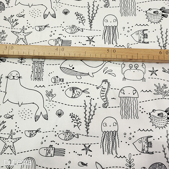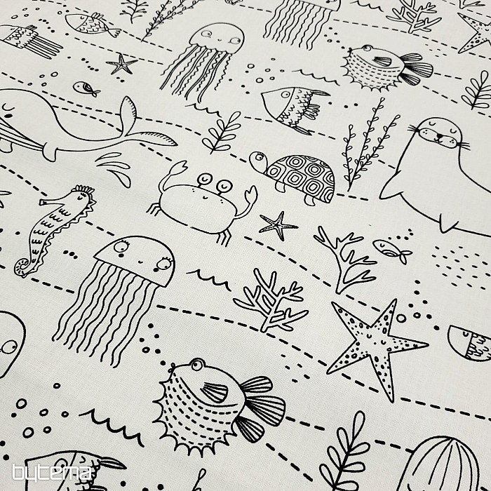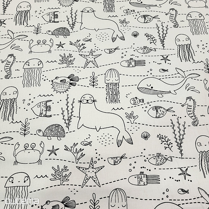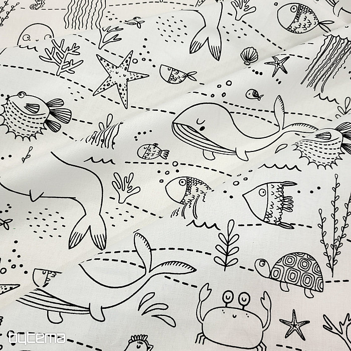 Víz alatti állatokkal díszített anyag, amit a gyerekek a képzeletük szerint színezhetnek ki.
