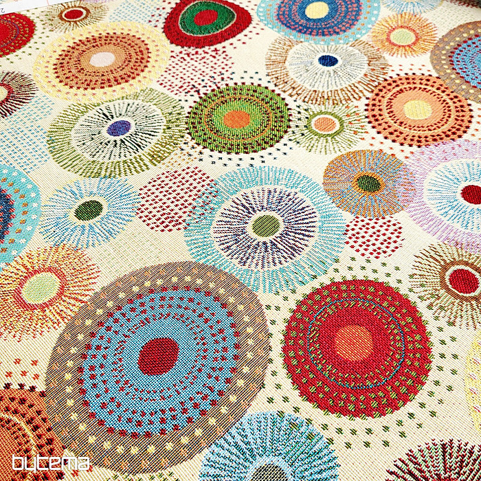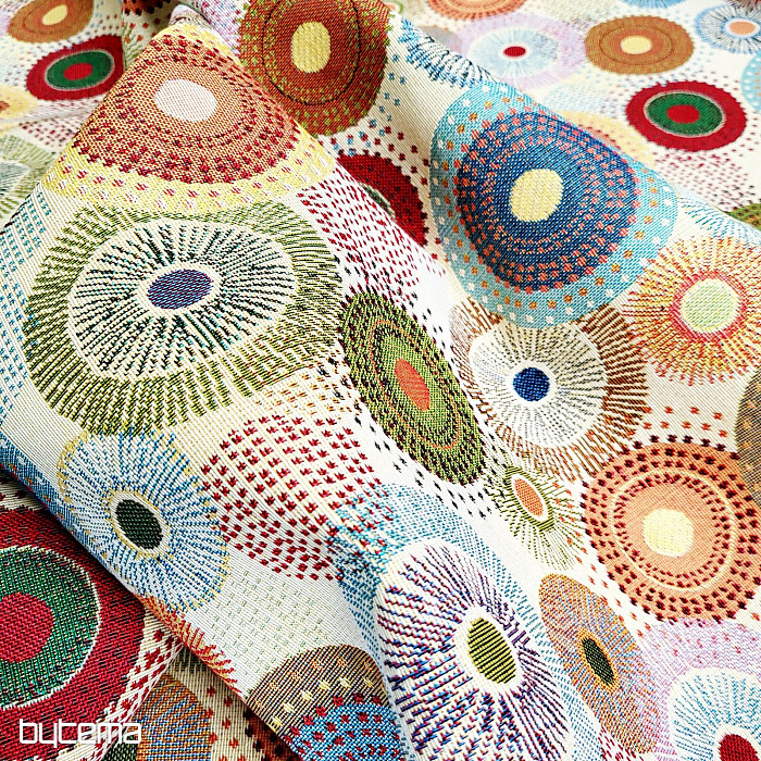 Újdonság a színes mandala kerekekkel díszített gobelin anyag. A visszafogott, mégis élénk színek eleganciát kölcsönöznek az anyagnak.