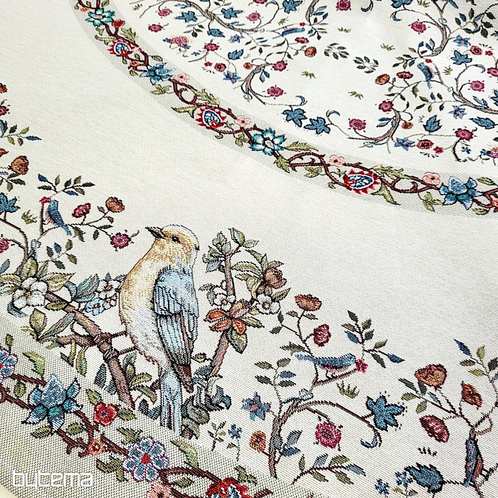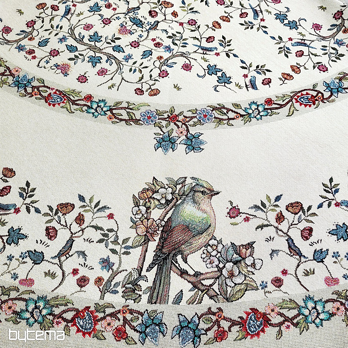 Gyönyörű, kerek terítő masszív gobelinből, különböző színű madarakkal és virágokkal. Tökéletes kiegészítő vagy ajándék madárbarátoknak.