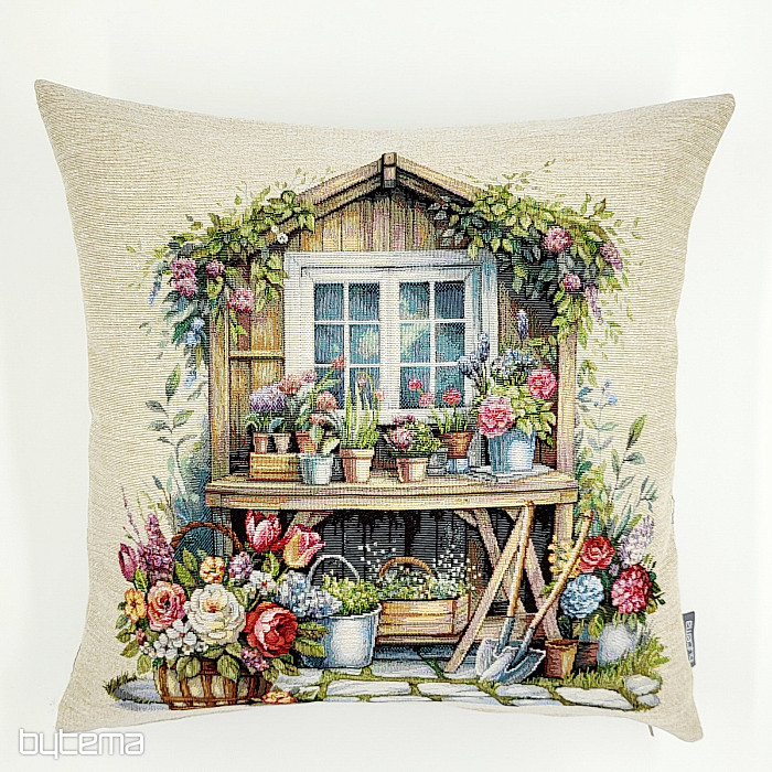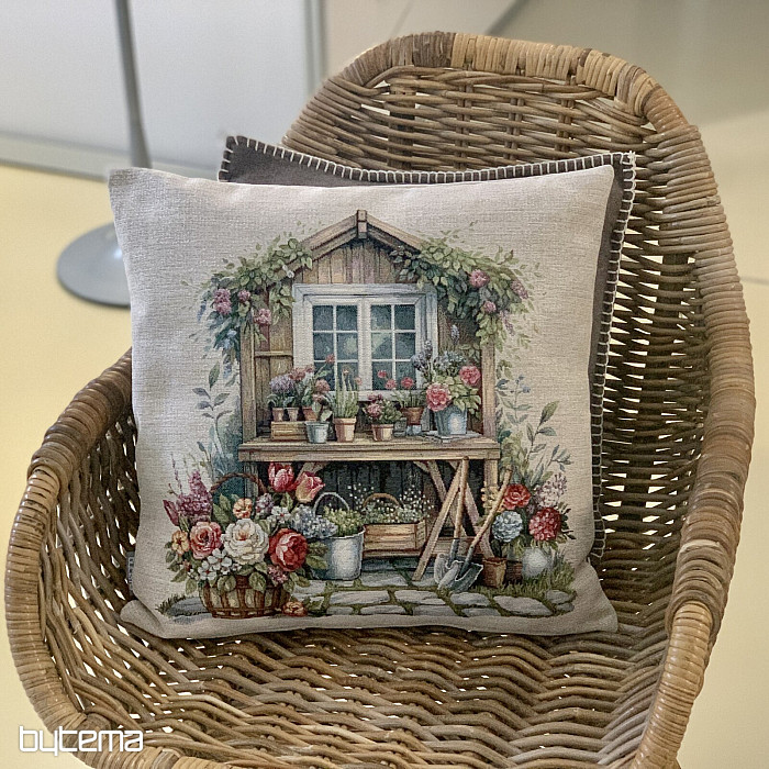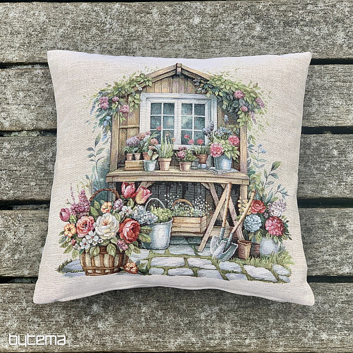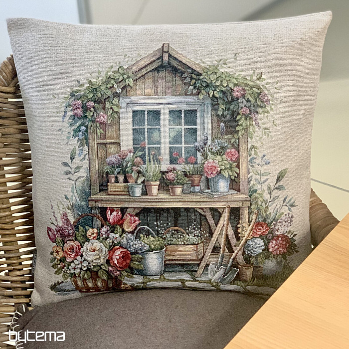 Gobelin párnahuzat virágokkal teli kerti házikóval. A huzat mintája tavaszi kényelmet és melegséget áraszt.