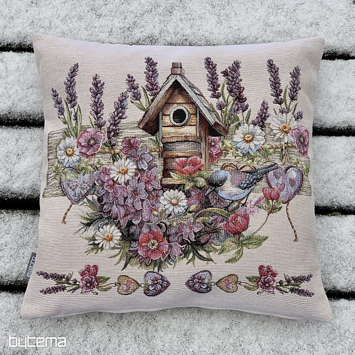 Gobelin párnahuzat madárházzal, madárral és finom levendulával. Gyönyörű és finom mintázata egész évben alkalmas otthonod dekorációjaként.