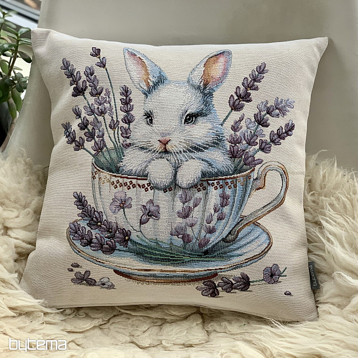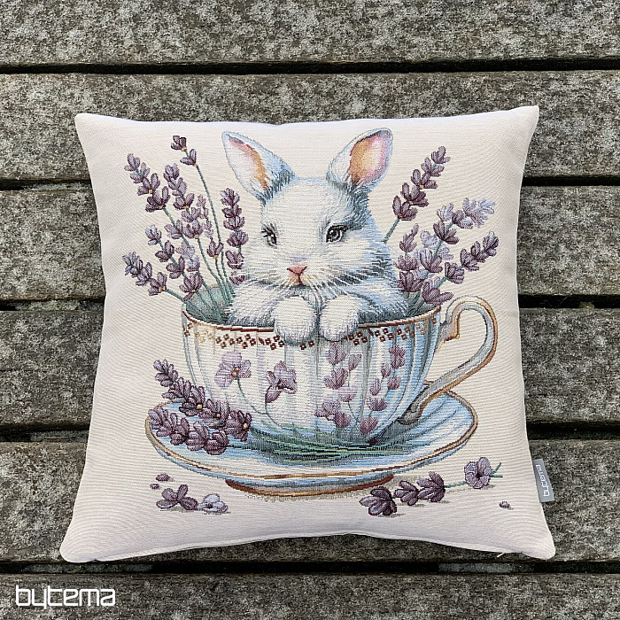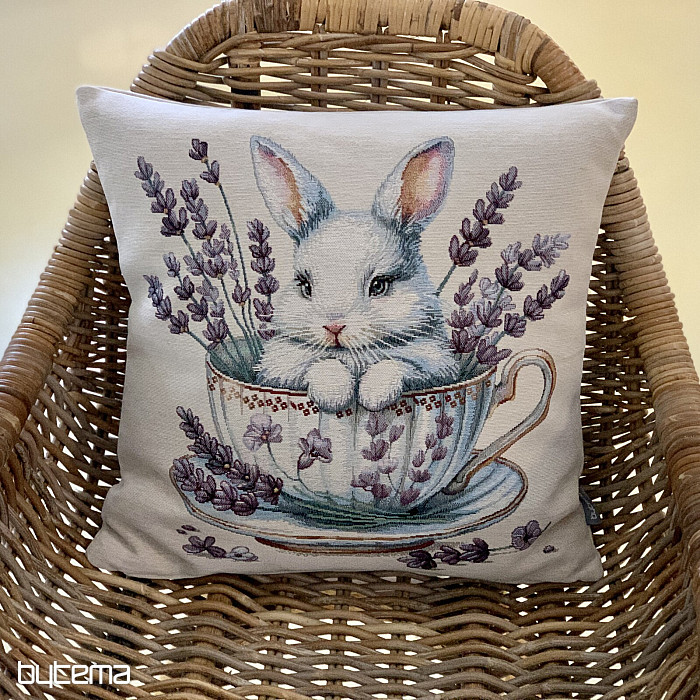Gobelin párnahuzat aranyos nyuszival, illatos levendulával díszített porcelán service-ben. Gyönyörű és finom dekoráció nem csak húsvétra.