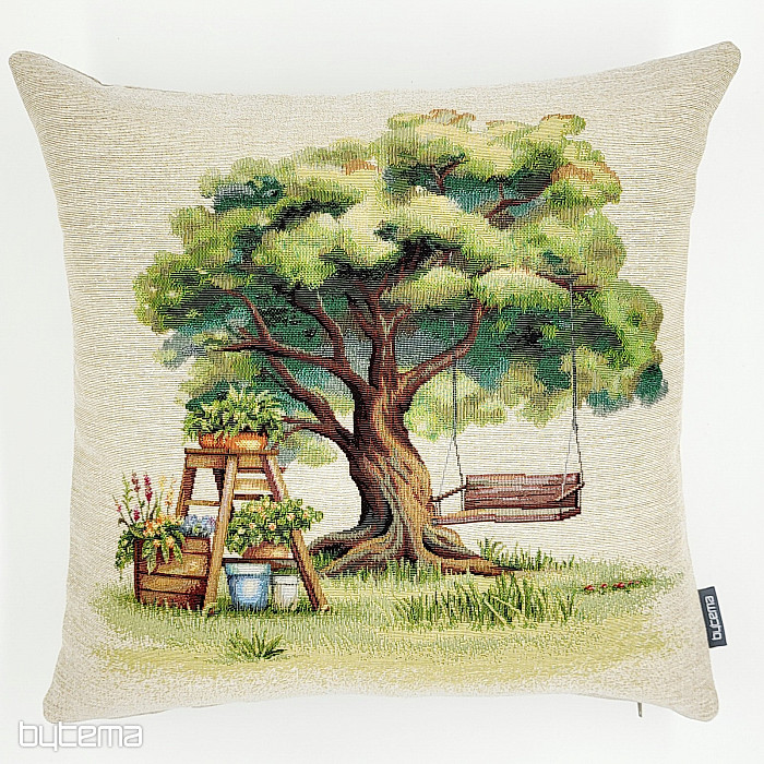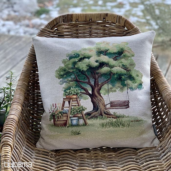 Gobelin párnahuzat pihenősarok motívummal. A fák alatti hinta ideális a kikapcsolódáshoz.