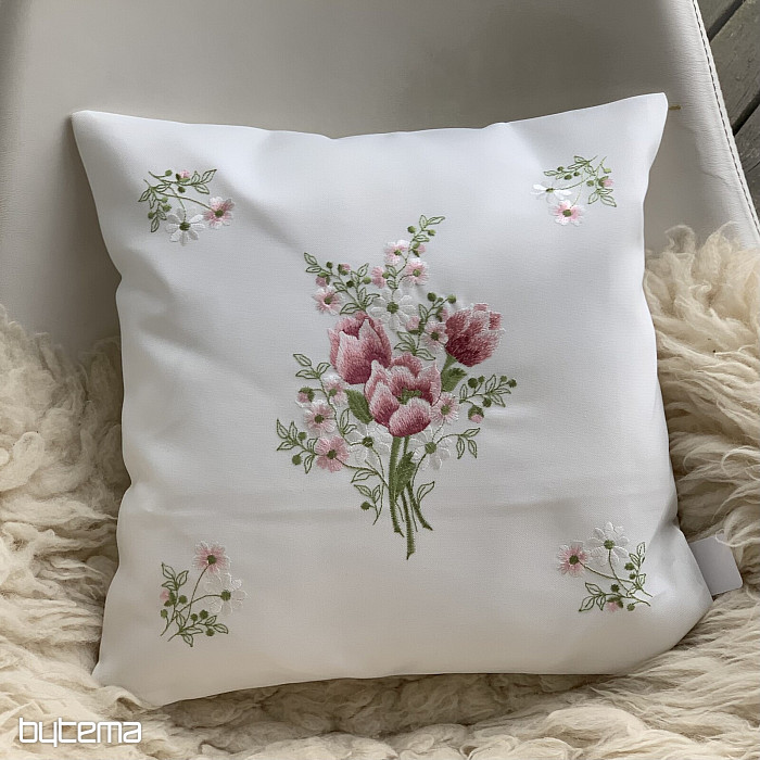 Finom hímzett díszborító rózsaszín tulipáncsokorral.
