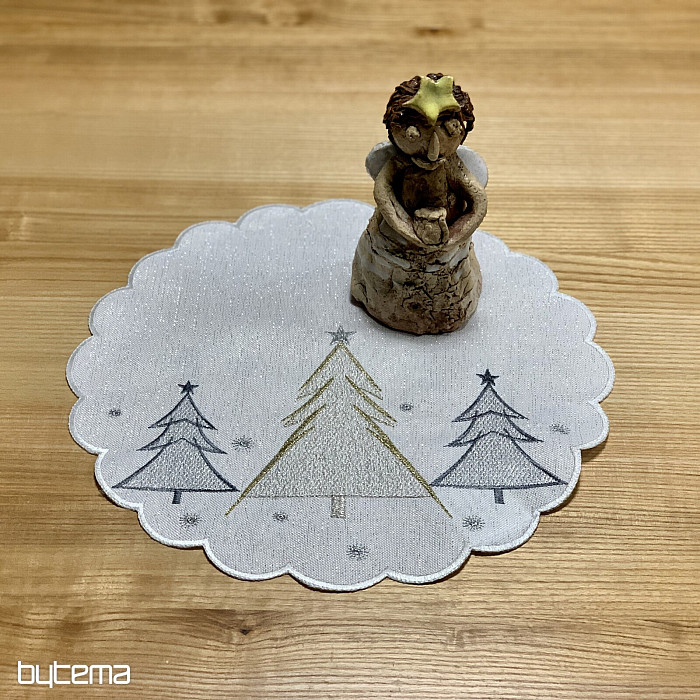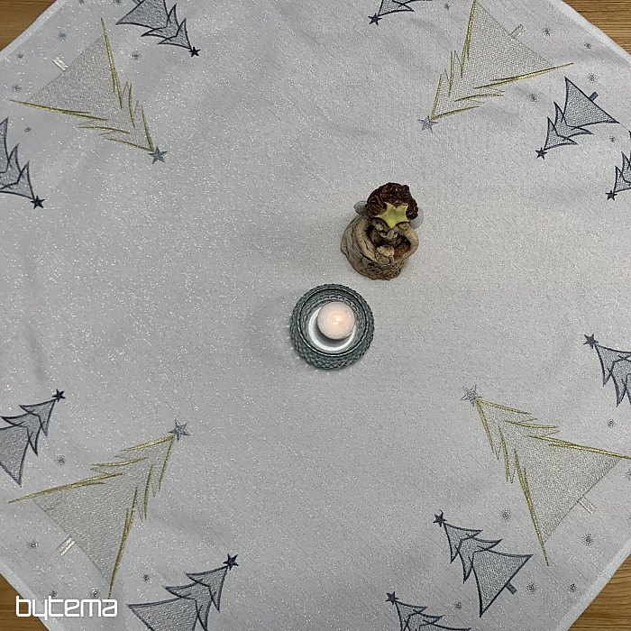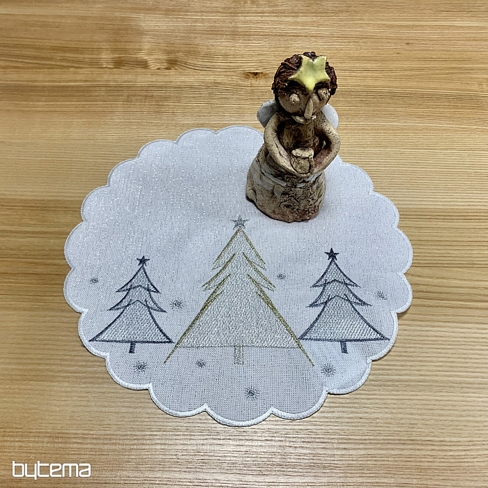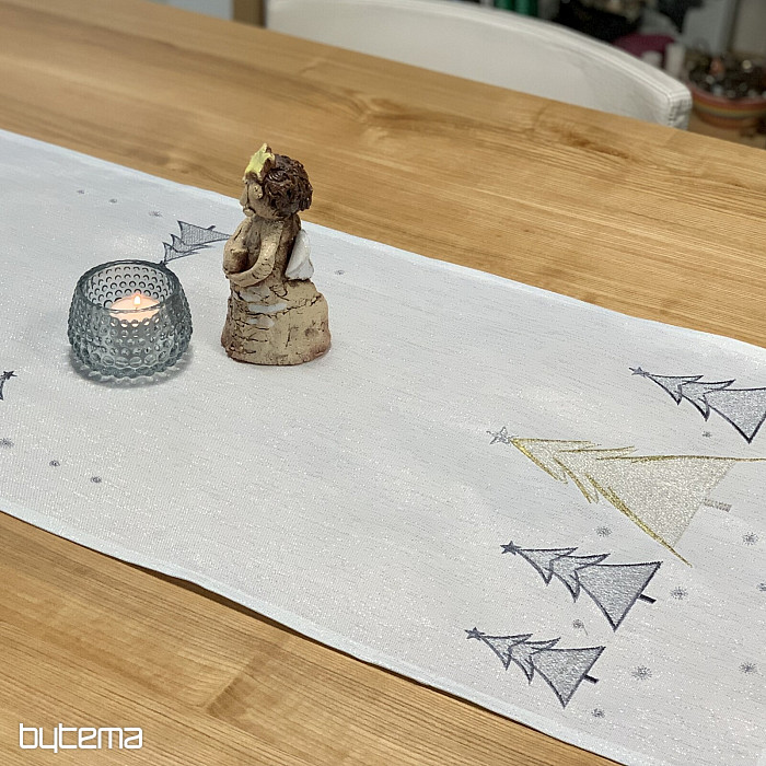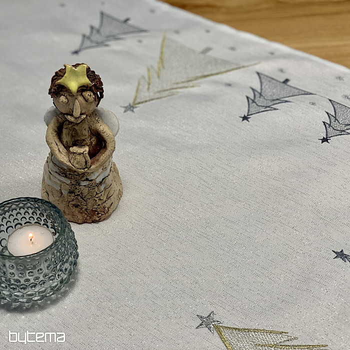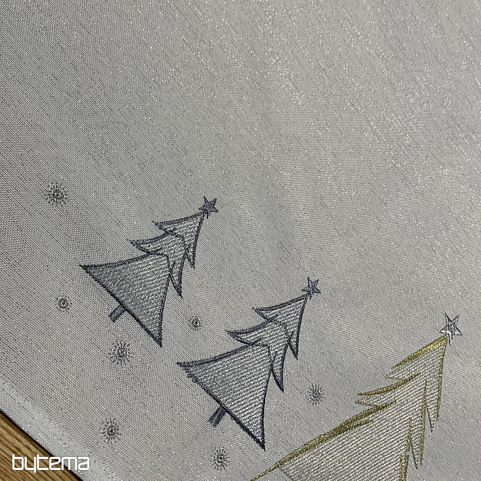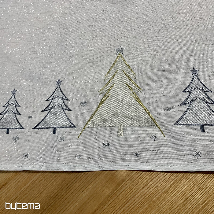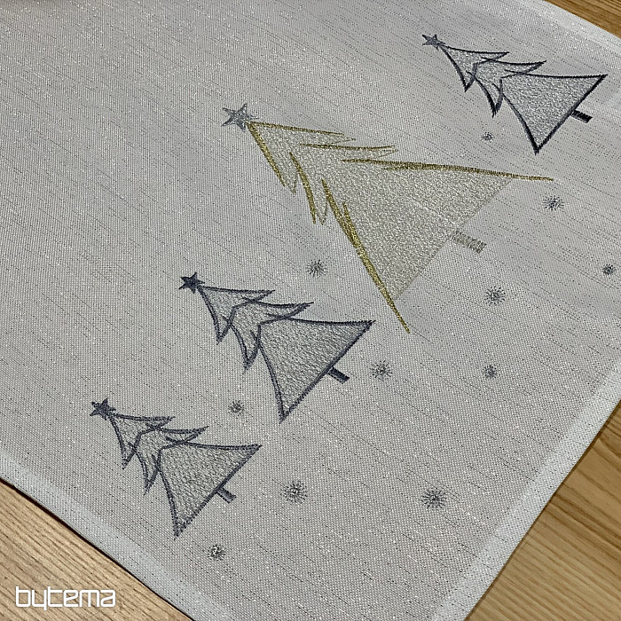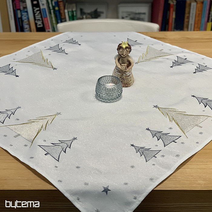 Egy ízlésesen és finoman hímzett karácsonyi terítő és sál, két színű fákkal, bájos kiegészítője lesz otthonodnak.