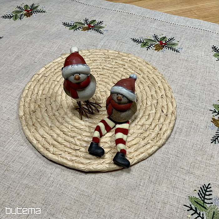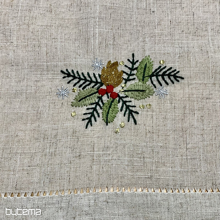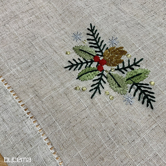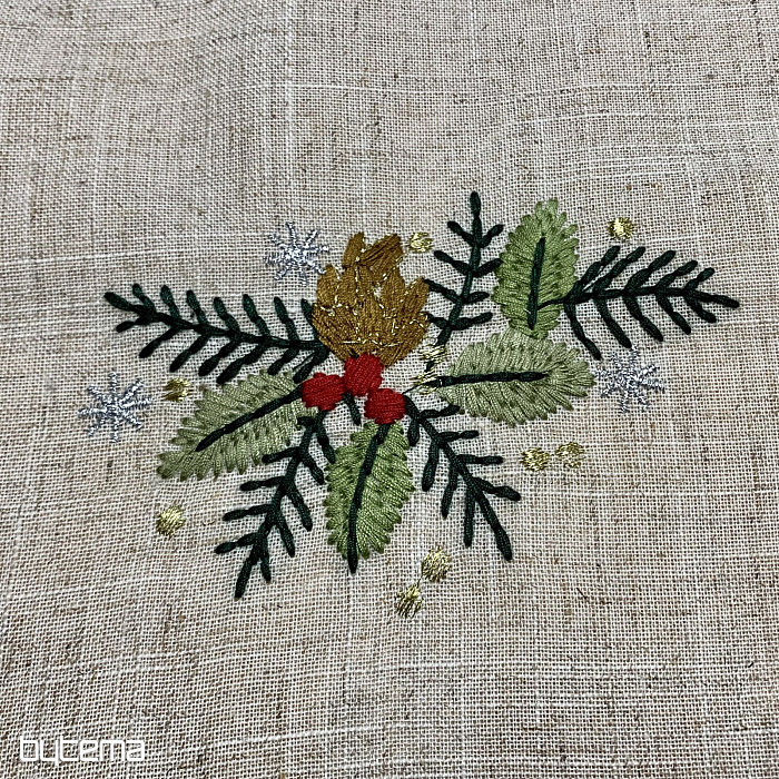 Egy karácsonyfa ágakkal díszített hímzett terítő gyönyörű kiegészítője lesz otthonodnak.