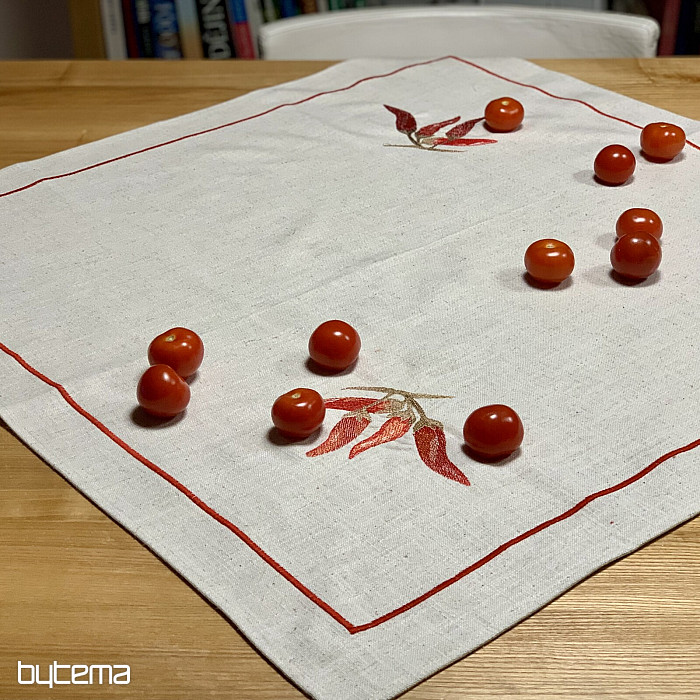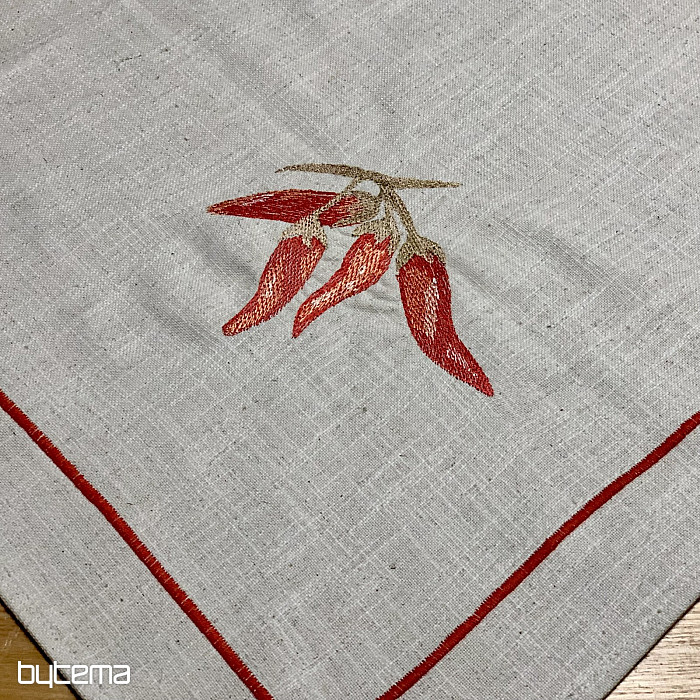 Gyönyörű anyagon, lenvászon beütéssel, pirospaprika hímzéssel.