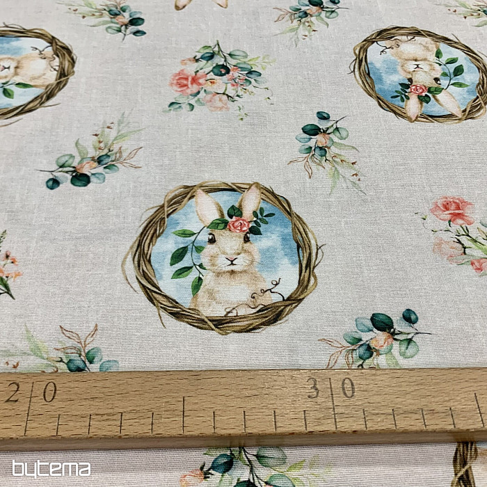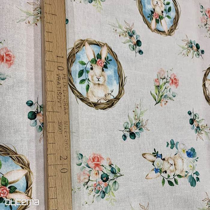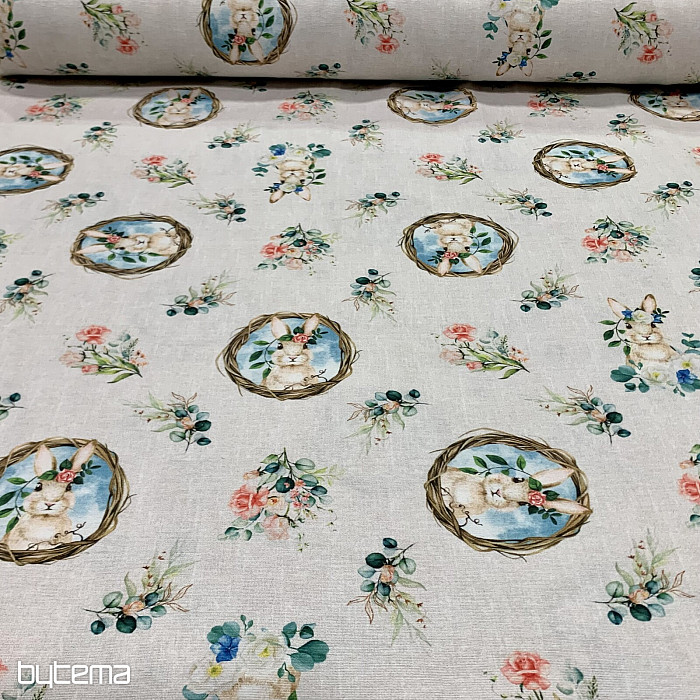 HÚSVÉTI NYUSZI rózsás mintás dekoratív anyag - szélessége 140 cm