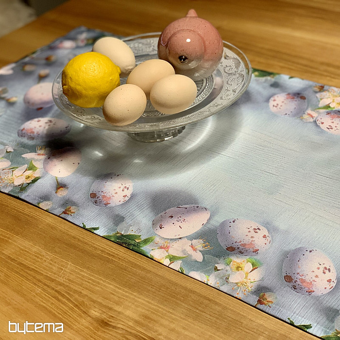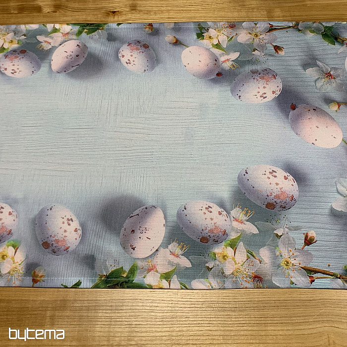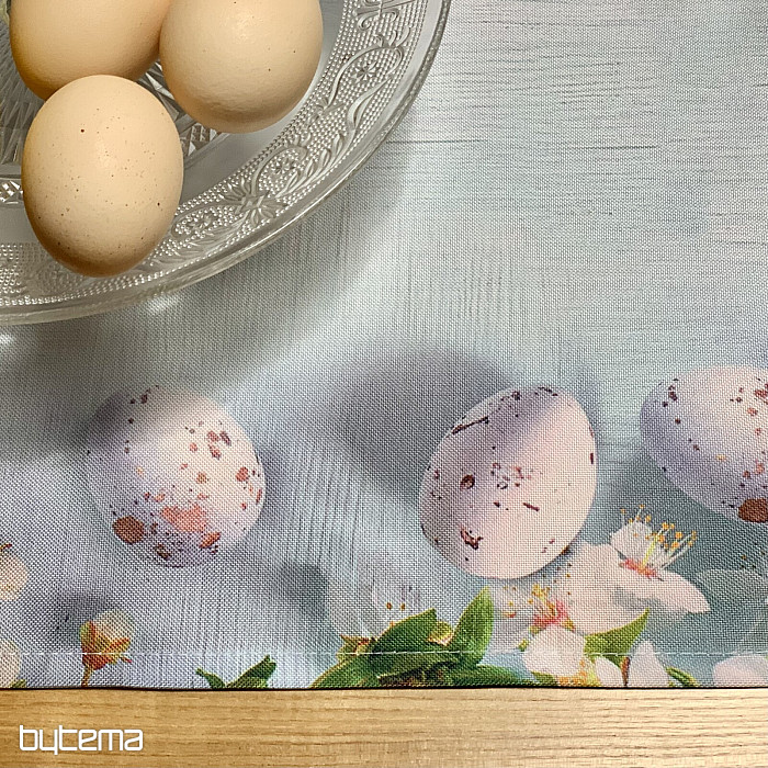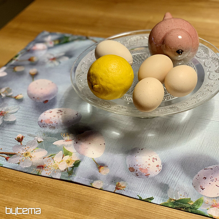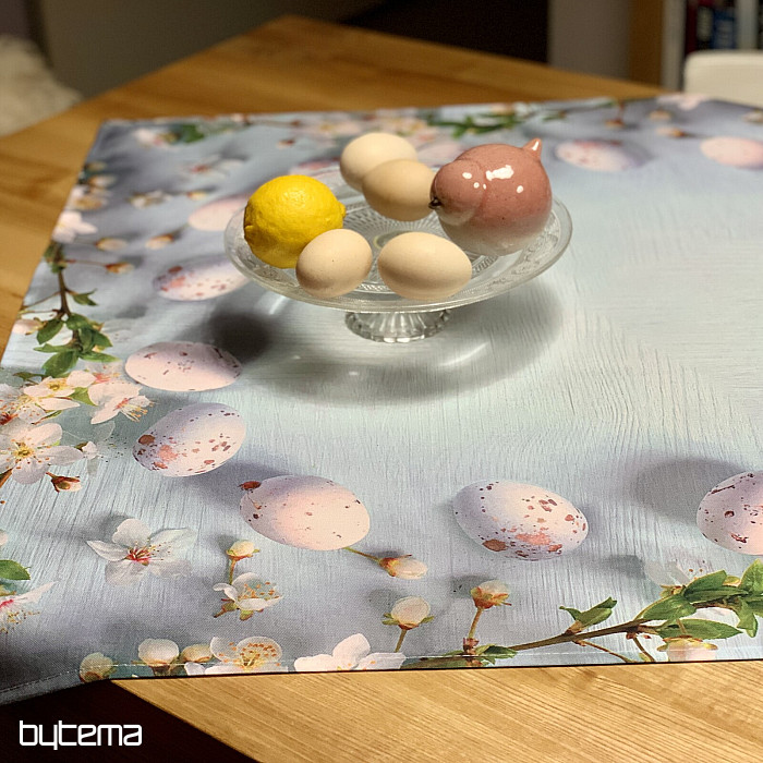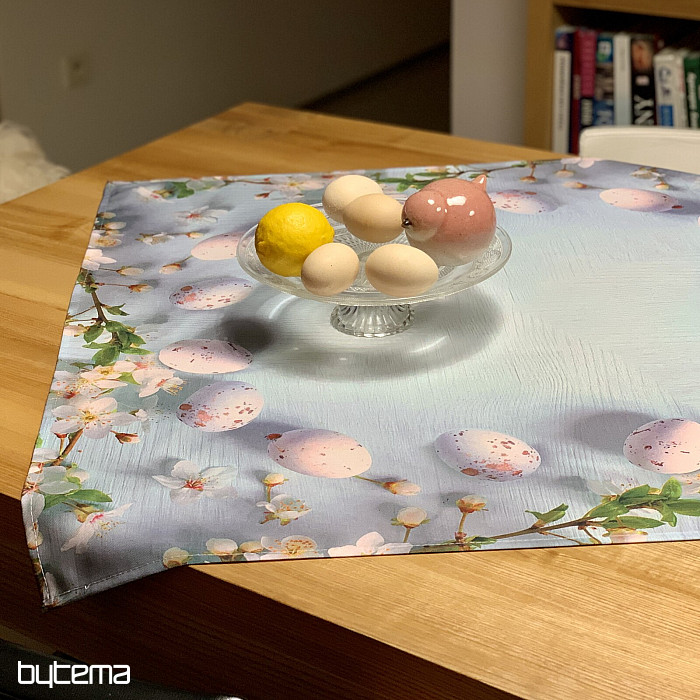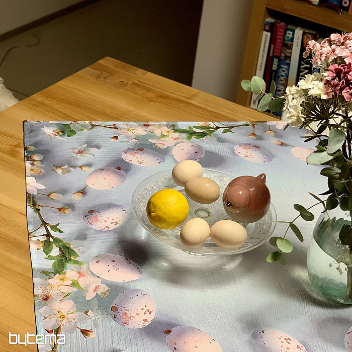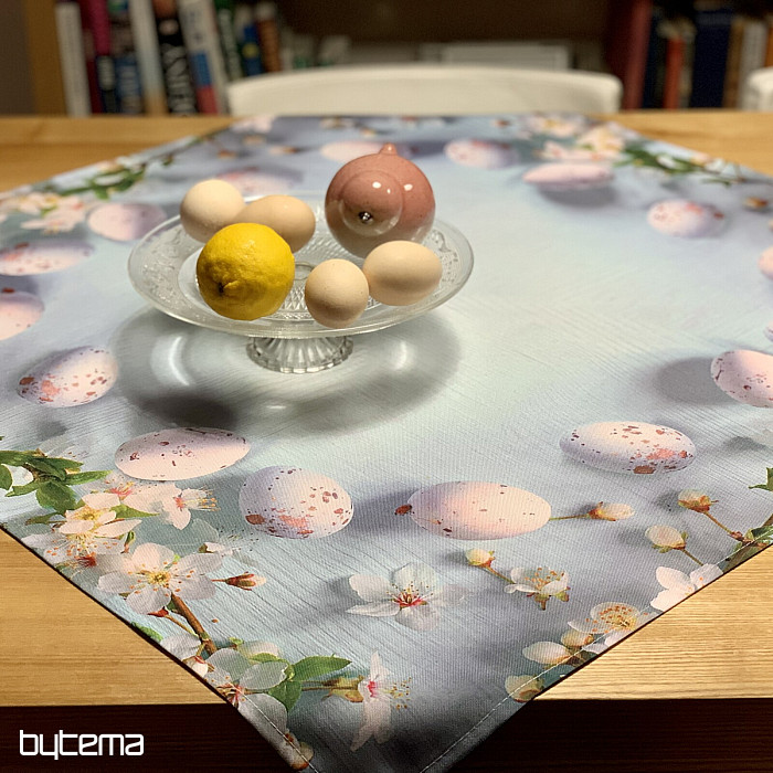 Modern, egyszerű húsvéti terítők és sálak cseresznyevirág és tojás motívummal.