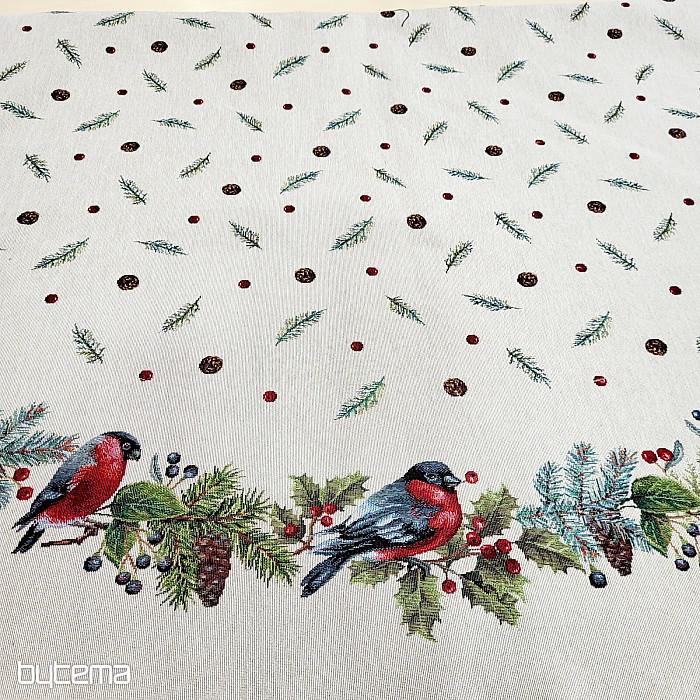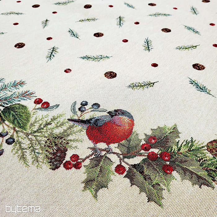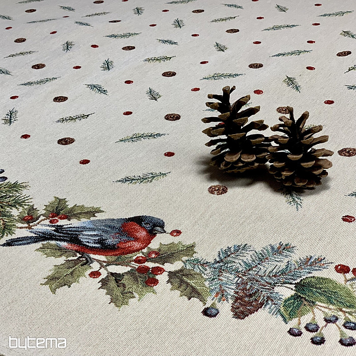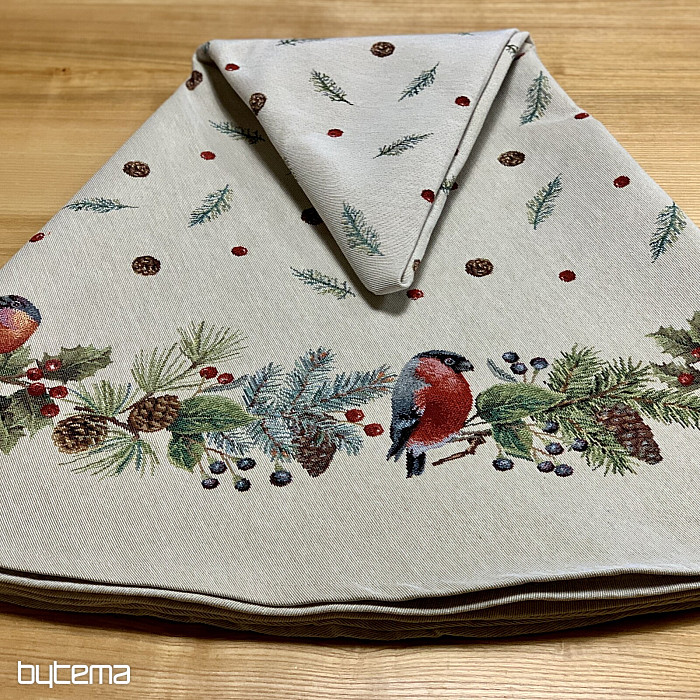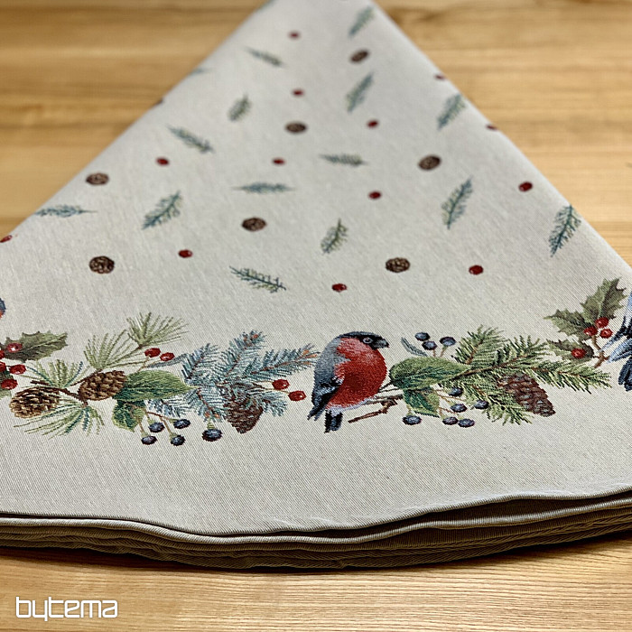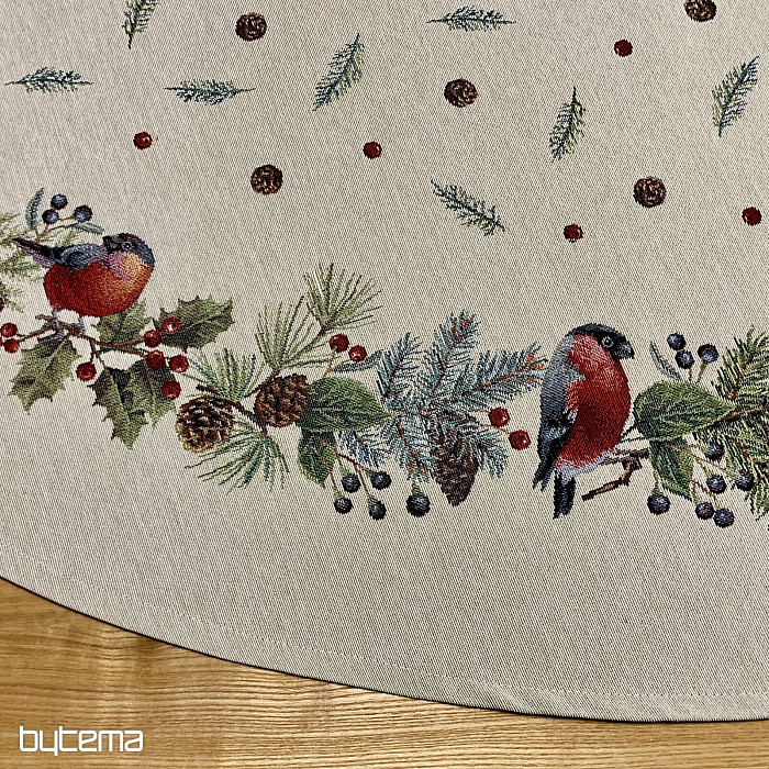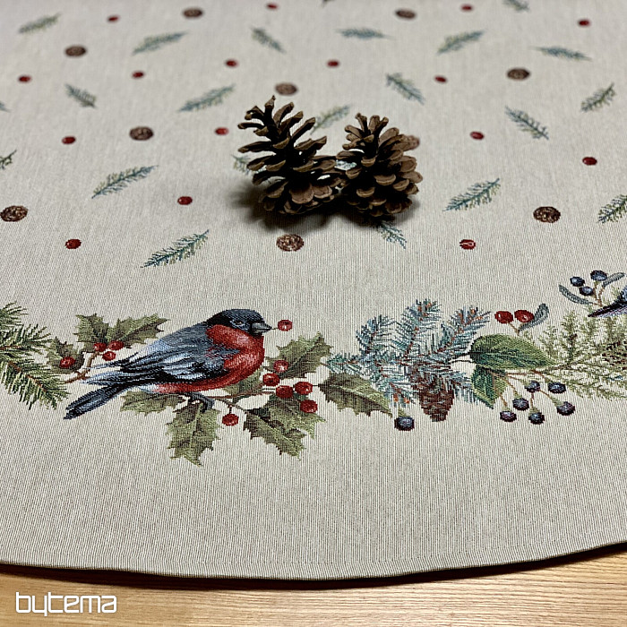 Karácsonyi kerek terítő gobelin anyagból, téli madár - süvöltő - motívummal. Ne félj karácsonyi dekorációként használni ezt a terítőt.