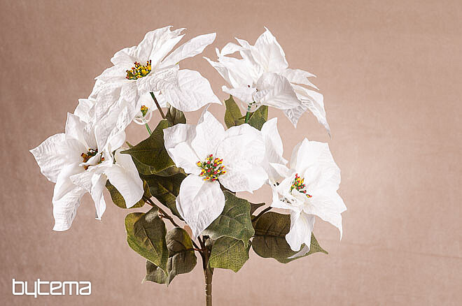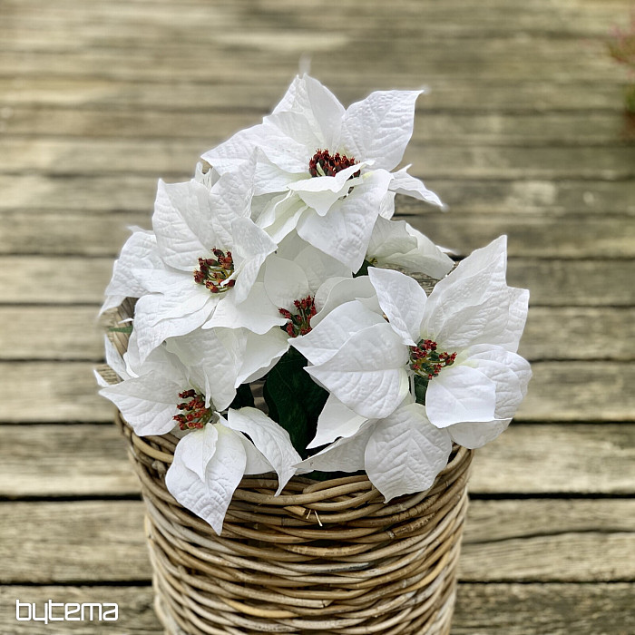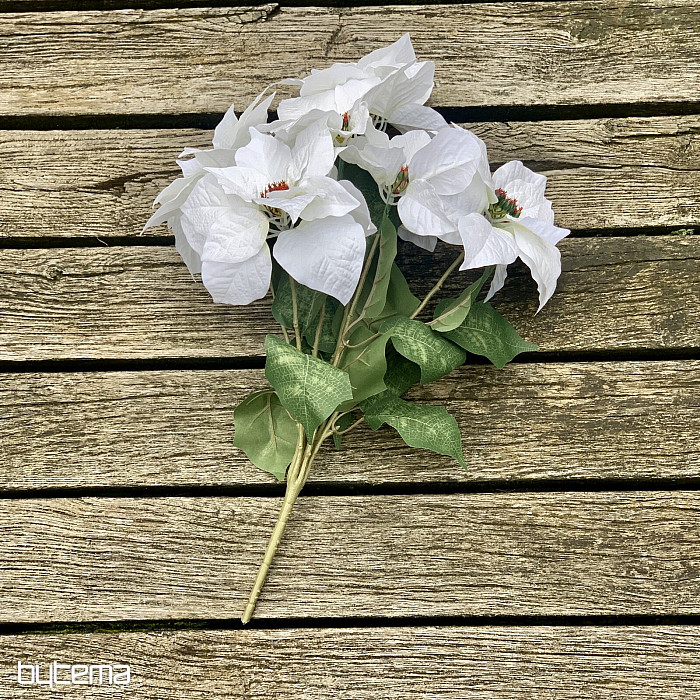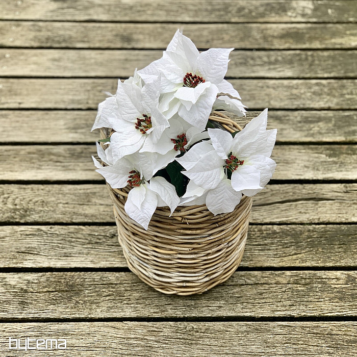 Egy nagy, jól megtervezett piros virágcsokor. Hét virág és sok levél alkot gazdag csokorban. A virág nagyon természetesnek tűnik, és szép megjelenésének köszönhetően lenyűgöző dekorációt nyújt a karácsonyi szezonban.