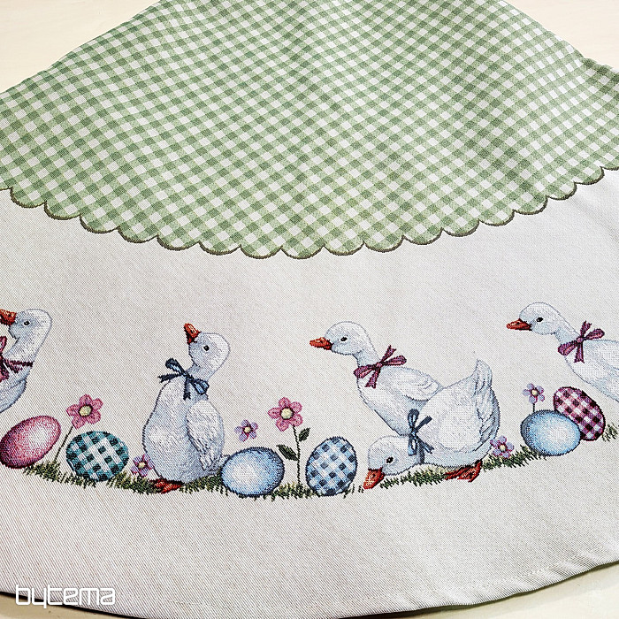 Húsvéti gobelin kerek terítő zöld kockás mintával és libákkal. Gyönyörű dísz a kerek asztalra.