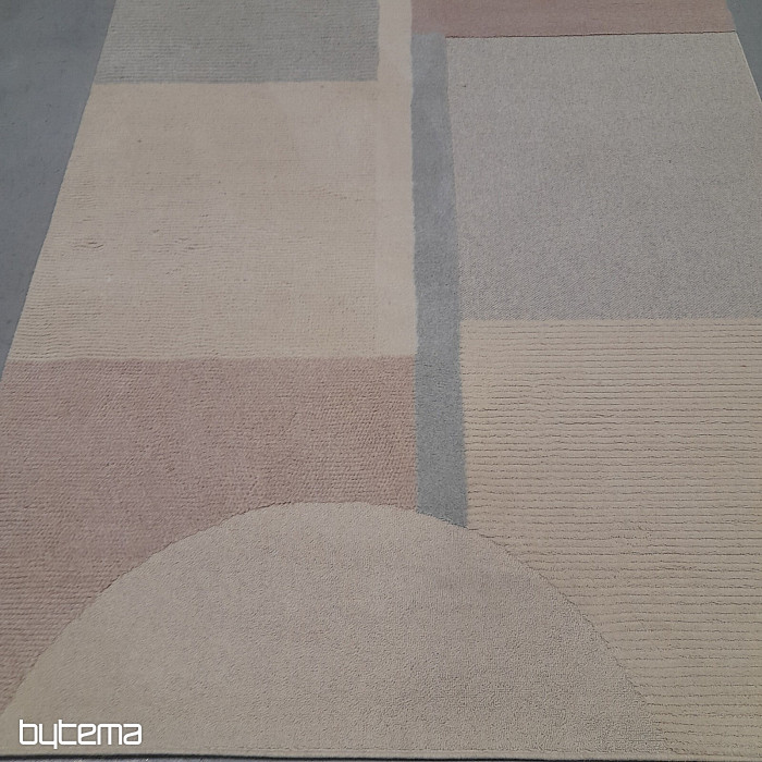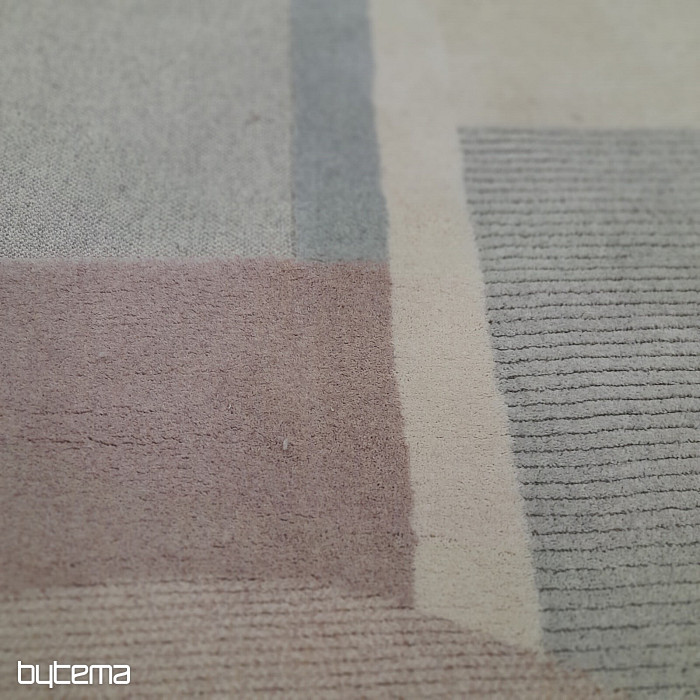 Luxus belga szőnyeg pasztell színekben, 3D geometrikus mintákkal. A plasztikus hatást a különbözően elrendezett bolyhok hozzák létre, amelyek juhgyapjúból készülnek. Ez garantálja a szőnyeg nagyfokú ellenálló képességét és tartósságát.