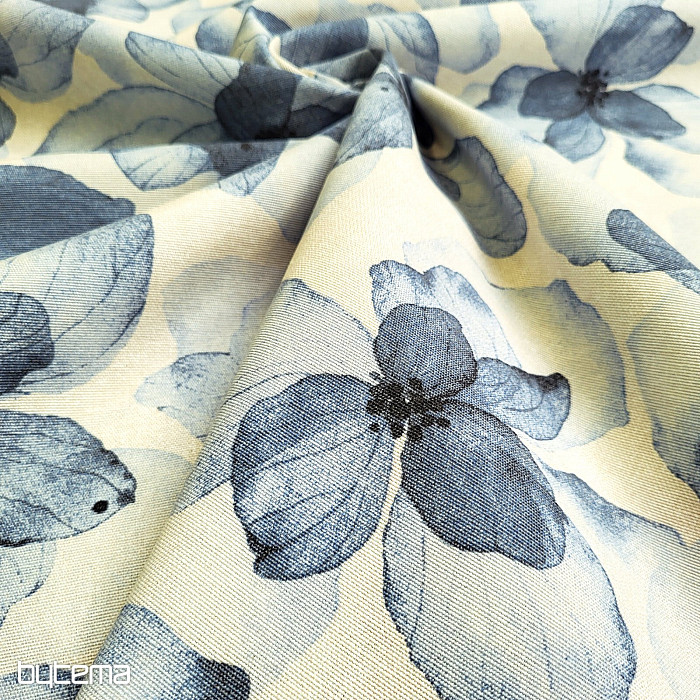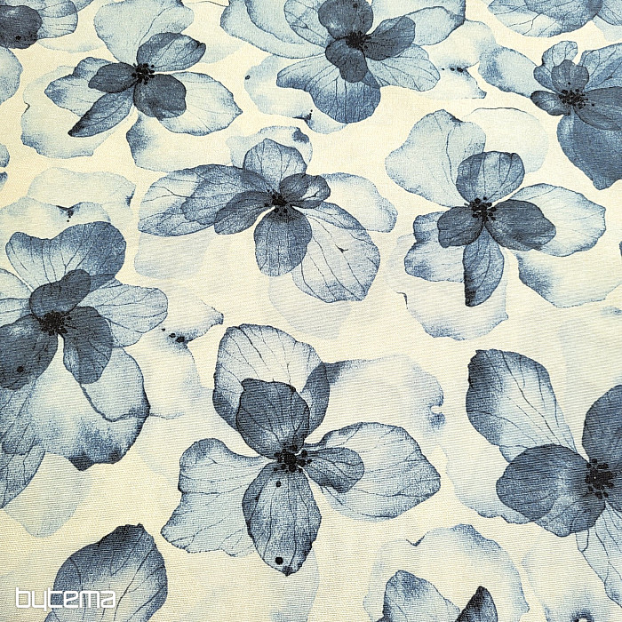 Dekoratív anyag nagy virágokkal kék árnyalatokban.