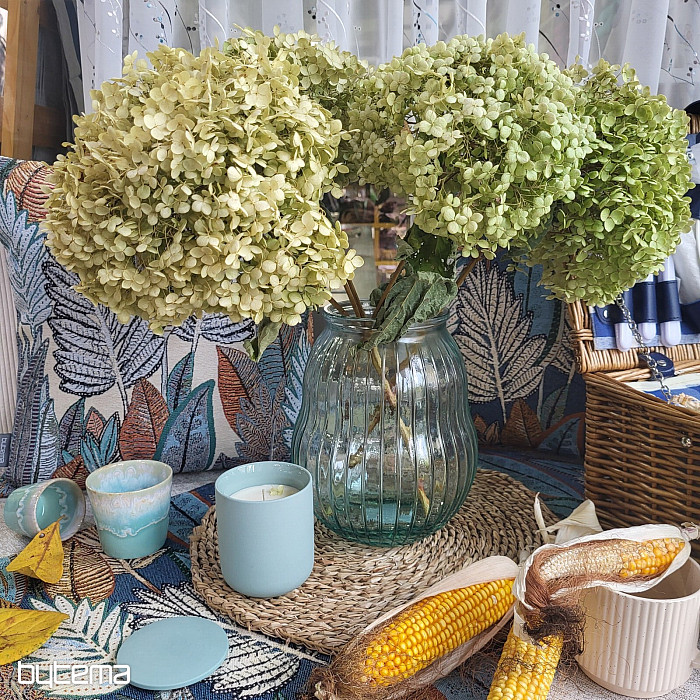 Az ALBANIA átlátszó üvegváza szezonális csokorral egyedi dísze lesz étkezőasztalának vagy pergolájának.